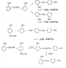 縮合及縮聚反應(yīng),隨反應(yīng)條件的不同可以發(fā)生在羥甲基苯酚與苯酚分子之間,也可發(fā)生在各個羥甲基苯酚分子之間。包括: