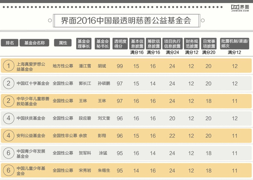 界面發(fā)布了其第一份基金會(huì)榜單——“2016中國最透明慈善公益基金會(huì)排行榜”。該榜單共有50家基金會(huì)入選,上海真愛夢想公益基金會(huì)作為地方性公募基金會(huì),今年名列榜首,中國紅十字基金會(huì)和中華少年兒童慈善救助基金會(huì)并列第二。50家基金會(huì)的2015年捐款收入總額為90.1億元,較其2014年的捐款收入總額73.5億元增長了21.6%。(美通社,2017年1月6日北京)
