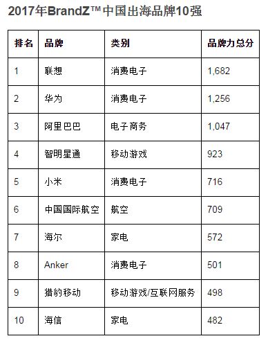 WPP和凱度華通明略聯(lián)手Google發(fā)布了首期“BrandZ中國出海品牌30強”排行榜及報告。聯(lián)想以1,682的品牌力得分一馬當先,成為最強大的中國出海品牌。緊隨其后的是,華為(1,256)以及阿里巴巴(1,047)。報告指出,消費者對中國產(chǎn)品的負面認知正在下降,互聯(lián)網(wǎng)驅(qū)動品牌潛力巨大,中國品牌行動速度往往快于西方品牌。(美通社,2017年1月10日北京)