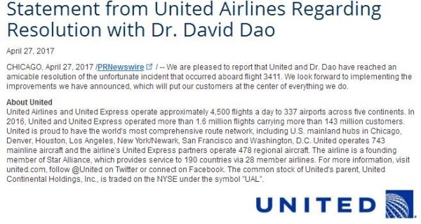 4月9日,美聯(lián)航將一位拒絕放棄座位的亞裔醫(yī)生David Dao暴力拖拽下機,引發(fā)大范圍輿論抗議。27日,美聯(lián)航在通過美通社發(fā)布的一份聲明中表示,已經(jīng)與David Dao達成和解,但未透露具體金額。同天,美聯(lián)航宣布推出10項整改承諾,除非安全或保安受到威脅,不會要求已經(jīng)登機的乘客非自愿放棄其機位,且將提高自愿棄程賠償金的上限至一萬美元。美聯(lián)航在聲明中稱,“我們期待在未來實施我們已經(jīng)宣布的改進措施,這將使顧客成為我們一切努力的中心。”(美通社,2017年4月27日芝加哥)
