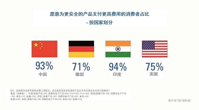 知名認(rèn)證機(jī)構(gòu)TUV南德意志集團(tuán)進(jìn)行了一項(xiàng)全球性的獨(dú)立研究,選取了中國(guó)、德國(guó)、印度和美國(guó)這四個(gè)國(guó)家的數(shù)個(gè)一線(xiàn)城市作為樣本,寫(xiě)成《TUV南德意志集團(tuán)消費(fèi)品安全報(bào)告》。報(bào)告顯示,中國(guó)消費(fèi)者對(duì)產(chǎn)品安全的關(guān)注程度不斷提升。在被調(diào)查的中國(guó)消費(fèi)者中有63%的人表示,產(chǎn)品安全現(xiàn)在對(duì)他們來(lái)說(shuō)非常重要,而且在2007年,這一比例僅為53%。中國(guó)企業(yè)對(duì)產(chǎn)品的安全意識(shí)也在四個(gè)受訪(fǎng)國(guó)中排名第一,從2012年的72%上升至年93%,其次分別是德國(guó)(201680%),印度(62%)及美國(guó)(62%)。在中國(guó),愿意為產(chǎn)品支付更高價(jià)格的消費(fèi)者的比例達(dá)到了93%,遠(yuǎn)超美國(guó)的75%和德國(guó)的71%。嬰童產(chǎn)品為消費(fèi)者愿意“花高價(jià),買(mǎi)安全”的產(chǎn)品。(美通社,2017年5月8日上海)