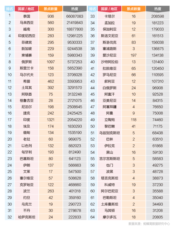 近日,螞蜂窩發(fā)布了《2017絲綢之路旅游大數(shù)據(jù)報(bào)告》,對(duì)“一帶一路”沿線64個(gè)境外國(guó)家和地區(qū)的旅游熱度、旅游資源分布進(jìn)行了分析。其中,東南亞成為“一帶一路”上的旅游大熱門,在旅游熱度排行榜中,占領(lǐng)了前7所有席位,前20中亦占領(lǐng)11位。泰國(guó)無(wú)論在旅游熱度還是旅游資源方面,都處于領(lǐng)先地位。位于歐洲邊緣的格魯吉亞,盡管熱門旅游景點(diǎn)僅有28個(gè),旅游熱度仍排在了第14位,遠(yuǎn)遠(yuǎn)超過(guò)其他擁有同等旅游資源的國(guó)家。埃及成為唯一排在前20位的非洲國(guó)家。(美通社,2017年5月10日北京)
