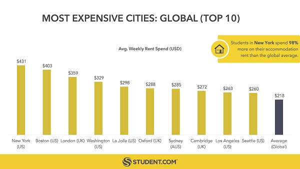 全球最大的學(xué)生住宿平臺student.com發(fā)布了一份全球?qū)W生住宿指數(shù)報(bào)告。報(bào)告發(fā)現(xiàn),對學(xué)生而言,房租最貴的城市分別是紐約、波士頓和倫敦,而最便宜的三個(gè)城市都在美國境內(nèi),分別是奧本、阿森斯和塔拉哈西。這份排名是student.com根據(jù)其網(wǎng)站租房數(shù)據(jù)得出的。在紐約的學(xué)生每周花在住宿上的開銷達(dá)431美元,比全球平均水平高出98%。(美通社,2017年5月22日倫敦)
