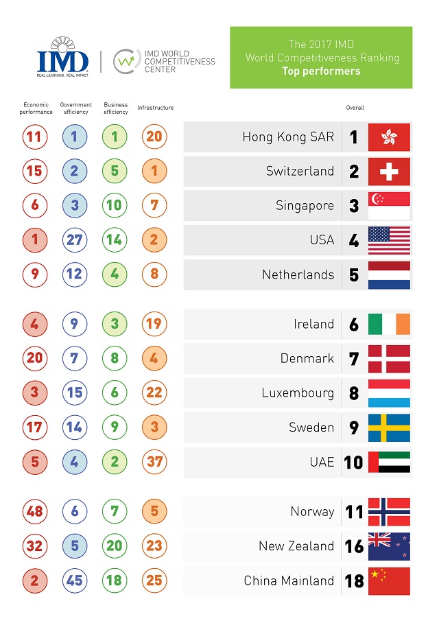 由 IMD(瑞士洛桑國際管理發(fā)展學(xué)院)世界競爭力中心編纂的年度排行榜中,香港鞏固了其主導(dǎo)地位,連續(xù)第二年位居榜首。瑞士和新加坡分列第2名和第3名,美國則由去年的第3名下滑至第4名,創(chuàng)造了五年來的最低排名。前五名還包括荷蘭 -- 由去年的第8名躍升至第5名。中國大陸今年上升了7個名次,排在第18名。今年,IMD 世界競爭力中心首次單獨(dú)發(fā)布了一份關(guān)于國家/地區(qū)數(shù)字競爭力排名的報告,排在前幾位的依次是新加坡、瑞典、美國、芬蘭和丹麥。(美通社,2017年6月1日瑞士洛桑)
