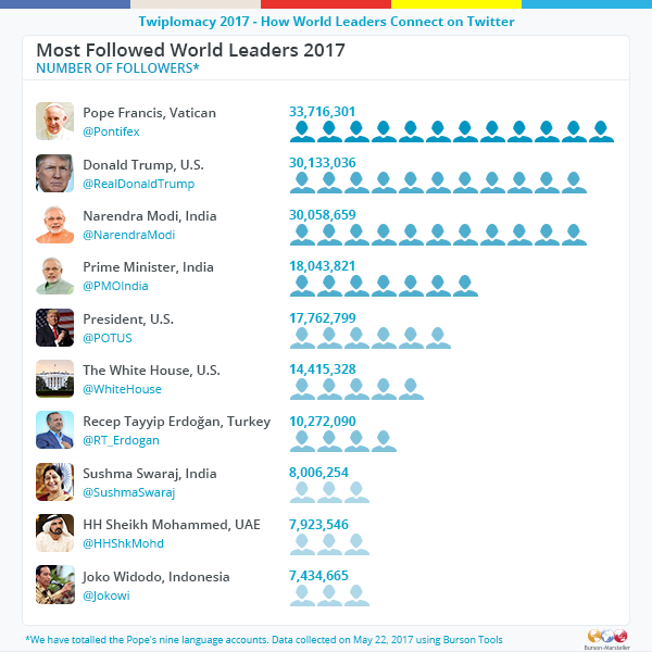 博雅公關(guān)的年度“推特外交”研究顯示,教皇方濟(jì)各是推特上最多人關(guān)注的世界領(lǐng)袖,粉絲數(shù)超3371萬,領(lǐng)先于美國總統(tǒng)特朗普的3013萬。排在第三位的是印度總理莫迪,粉絲數(shù)為3005萬。全球178個國家的276位政府首腦、外長都在使用推特,超過Facebook,后者僅有169位政府首腦在其網(wǎng)站上開設(shè)了專頁。但是,關(guān)注領(lǐng)導(dǎo)人Facebook專頁的粉絲數(shù)量平均是Twitter的兩倍。特朗普是少有的自己打理推特賬號的領(lǐng)導(dǎo)人之一,過去12個月,他的推特共產(chǎn)生1.66億次互動,約是印度總理莫迪的5倍。特朗普也是推特是被提及次數(shù)最多的領(lǐng)導(dǎo)人。(美通社,2017年5月31日紐約)