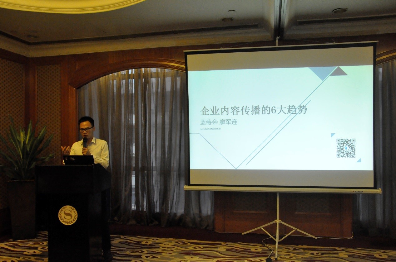 最后,藍莓會副總裁廖軍連就企業(yè)傳播提出了企業(yè)內(nèi)容資訊定位個性化、企業(yè)人物形象塑造IP化、粉絲溝通社群化、溝通方式娛樂化、傳播渠道多平臺化和內(nèi)容傳播的互動化這六大傳播趨勢。