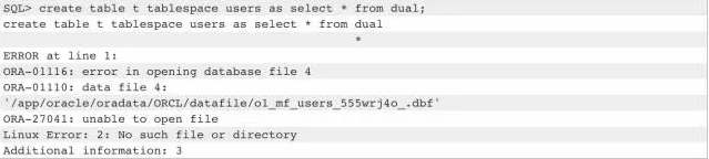 2. 嘗試在 users 表空間中創(chuàng)建表,開始報錯。