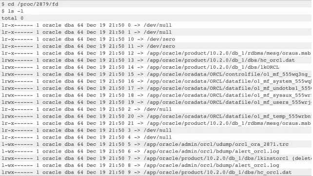 4. dbwr 會打開所有數(shù)據(jù)文件的句柄。在 proc 目錄中可以查到,目錄名是進程 PID,fd 表示文件描述符。