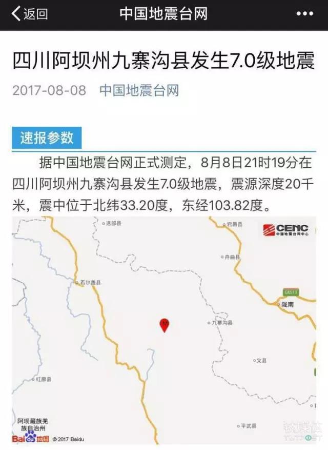 地震發(fā)生后的18 分鐘,由“中國(guó)地震臺(tái)網(wǎng)”官方微信推送了正式測(cè)定數(shù)據(jù):“根據(jù)中國(guó)地震臺(tái)網(wǎng)正式測(cè)定,8月8日21時(shí)19分,四川阿壩州九寨溝縣發(fā)生7.0級(jí)地震,震源深度20千米,震中位于北緯33.20度,東經(jīng)103.82度。”