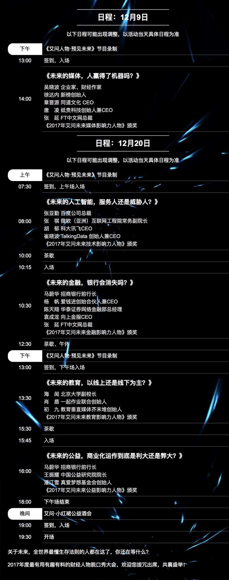 2017年艾問(wèn)人物峰會(huì)暨《預(yù)見(jiàn)未來(lái)》電視論壇定于12月20日于北京舉辦,科大訊飛總裁胡郁、雨果獎(jiǎng)作家郝景芳、FT中文總裁張延、中國(guó)公益研究院院長(zhǎng)王振耀等二十多名大咖也將同臺(tái)激辯十年后的新金融、新公益、新技術(shù)、新教育,定義“萬(wàn)變世界里的不變法則”!2017年度艾問(wèn)峰會(huì)電視論壇暨小紅裙公益酒會(huì),遇見(jiàn)彼此預(yù)見(jiàn)未來(lái)!