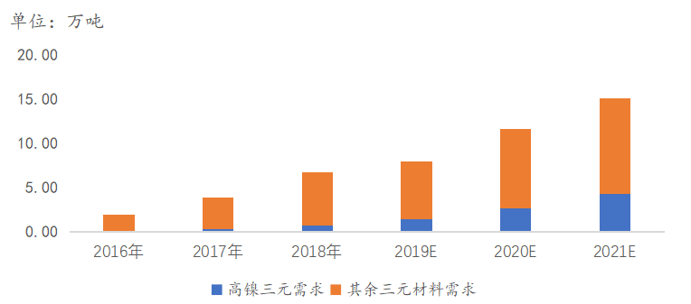 圖:2016-2021年中國動(dòng)力電池對高鎳三元的需求量