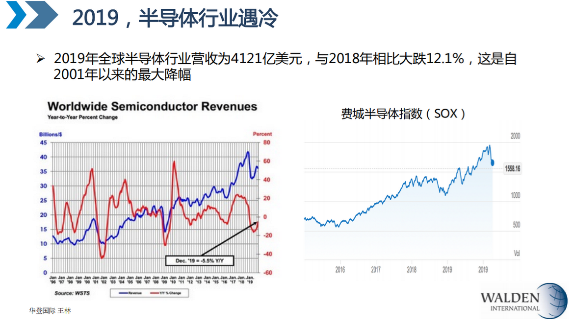 王林介紹,從2019年開始,半導(dǎo)體行業(yè)就進入了一種疲軟狀態(tài)。統(tǒng)計數(shù)據(jù)顯示,受整個行業(yè)周期性下滑的影響,2019年全球半導(dǎo)體行業(yè)營收為4121億美元,與2018年相比大跌12.1%,創(chuàng)下了2001年以來的最大降幅。同時2020年開年,受疫情影響,Gartner再度下調(diào)對2020半導(dǎo)體產(chǎn)業(yè)營收的預(yù)期,調(diào)低了108億美元。
