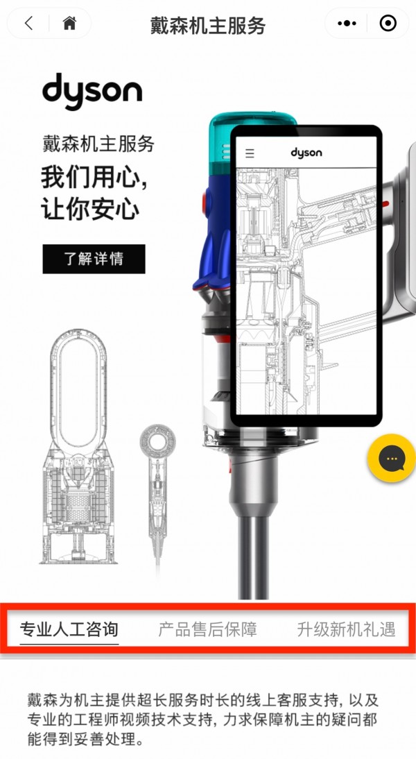 打開(kāi)Dyson小程序,可以看見(jiàn)「戴森機(jī)主服務(wù)」,其中提供專(zhuān)業(yè)人工咨詢、產(chǎn)品售后保障、升級(jí)新機(jī)禮遇。比如,針對(duì)用戶使用過(guò)程中的“疑難雜癥”,戴森提供了遠(yuǎn)程視頻維修工程師服務(wù)(Virtual Service Engineer,簡(jiǎn)稱(chēng)VSE),讓消費(fèi)者足不出戶就能通過(guò)遠(yuǎn)程視頻,獲得戴森工程師的一對(duì)一專(zhuān)業(yè)指導(dǎo)。
