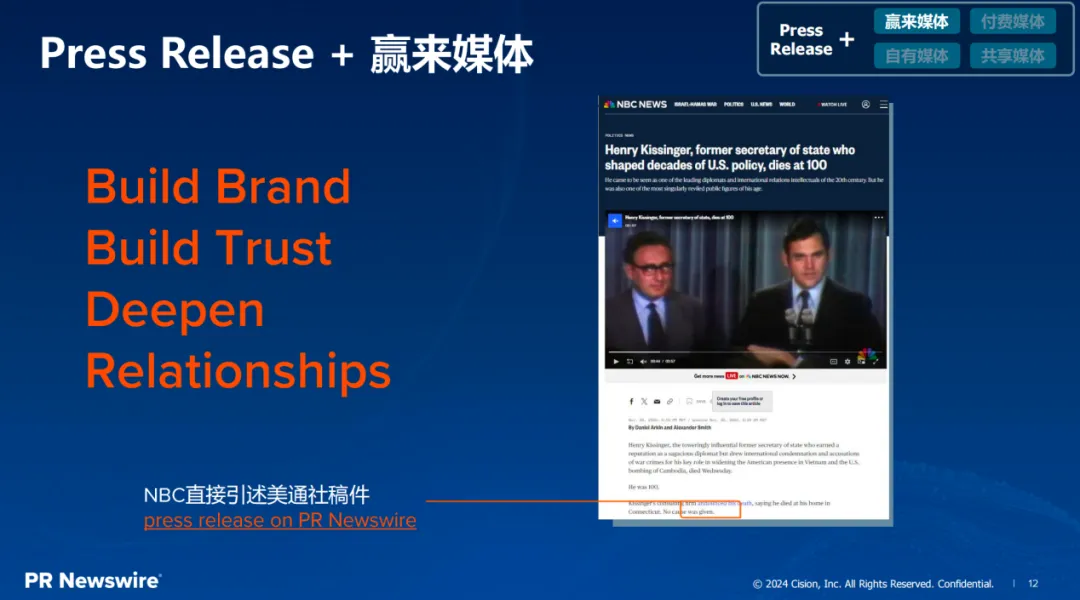 用案例來(lái)說(shuō)。去年年底美國(guó)的外交官基辛格去世時(shí),權(quán)威媒體NBC News在報(bào)道這種突發(fā)性新聞的時(shí)候,直接引用了美通社發(fā)布的官宣稿件,這種經(jīng)由正規(guī)新聞發(fā)布機(jī)構(gòu)發(fā)布的內(nèi)容,自然更容易贏得權(quán)威媒體的關(guān)注與信任。