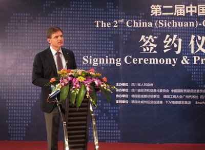 四川成都2011年10月18日電 /美通社亞洲/ -- 繼2010年TUV 南德意志集團(tuán)(以下簡(jiǎn)稱TUV SUD )在第一屆洽談會(huì)中代表德方企業(yè)與四川省機(jī)械研究設(shè)計(jì)院和四川省機(jī)械行業(yè)委員會(huì)簽訂技術(shù)合作諒解備忘錄之后,中德(四川)第二屆機(jī)械合作洽談會(huì)在成都凱賓斯基酒店隆重開幕。TUV SUD 大中華集團(tuán)總裁& CEO 范華德(Dirk von Wahl)先生蒞臨會(huì)議現(xiàn)場(chǎng)并發(fā)言。