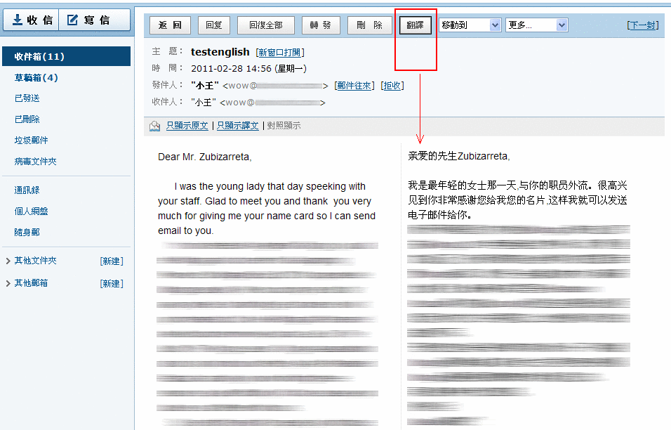 外貿(mào)型企業(yè)在日常工作溝通中,常會(huì)遇到英文郵件,網(wǎng)易企業(yè)郵箱依托網(wǎng)易有道翻譯的領(lǐng)先技術(shù),為 webmail 增加全文翻譯功能,用戶可在讀信時(shí),點(diǎn)擊頂部的“翻譯”按鈕,如下圖所示,把英文翻譯為中文。