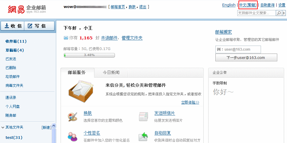 網(wǎng)易企業(yè)郵箱此次更新,增加了繁體版 webmail 界面,方便了香港、臺(tái)灣的企業(yè)用戶使用。用戶可通過(guò)登錄首頁(yè)的“繁體版”入口進(jìn)入繁體版郵箱,也可在簡(jiǎn)體或英文版登錄后,在 webmail 內(nèi)部的切換按鈕處,進(jìn)行繁體版切換,如下圖所示: