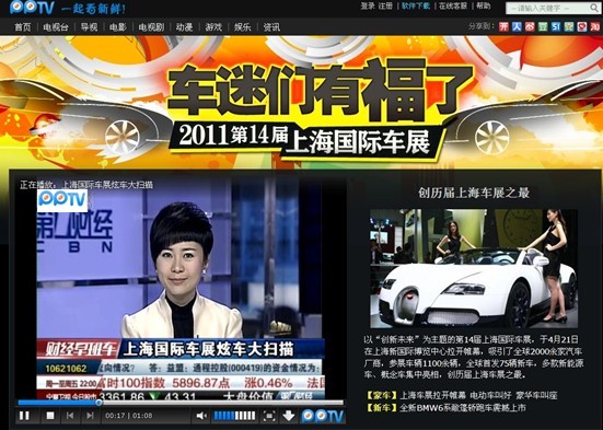 上海2011年4月25日電 /美通社亞洲/ -- 以“創(chuàng)新未來”為主題的2011第十四屆上海國(guó)際汽車展覽會(huì)于2011年4月21日-4月28日在上海隆重舉行。這是繼 PPTV 網(wǎng)絡(luò)電視連續(xù)4年成功直播車展后,再次以網(wǎng)絡(luò)電視直播新媒體的身份入駐本次上海車展第一現(xiàn)場(chǎng)。此外,PPTV 網(wǎng)絡(luò)電視上海車展專題頁(yè)面已首發(fā)上線(http://news.pptv.com/dsj/2011zt/2011shcar/index.html),第一時(shí)間全線報(bào)道本屆車展的四大精彩看點(diǎn),讓廣大車迷們大飽眼福。