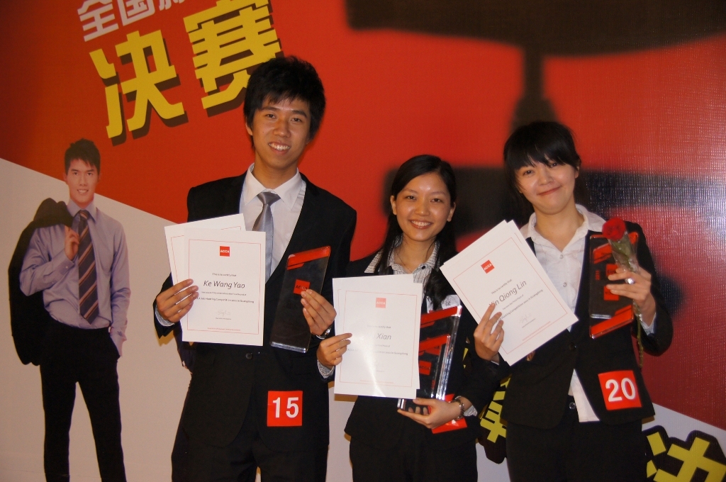 胡弦同學(xué)是暨南大學(xué)國際學(xué)院的大三學(xué)生,在班級中成績排名在前2%。她出眾英語能力深受評委們贊賞,此前還曾獲得廣東省大學(xué)生英語演講比賽第一名和全國 CCTV 英語演講比賽優(yōu)勝獎。決賽之前,她就曾經(jīng)在4月16日 ACCA 就業(yè)力大比拼前20選手“職業(yè)訓(xùn)練營”的人際交往練習(xí)環(huán)節(jié)中獲得選手們共同票選的第一名。當(dāng)時選手們的職業(yè)訓(xùn)導(dǎo)導(dǎo)師程煜麟先生總結(jié)了選手們的意見,認為胡弦獲勝的原因在于她在與人交談時始終表現(xiàn)出淡定、大方、誠懇和自信,讓與之交談的人感覺如沐春風(fēng)。亞軍柯汪堯同學(xué)也是一名大三學(xué)生,現(xiàn)就讀于廣東外語外貿(mào)大學(xué)國際商務(wù)英語學(xué)院國際貿(mào)易專業(yè),他在密鑼緊鼓準備比賽的同時還在廣交會實習(xí),毅力過人的他克服了時間的困難,帶領(lǐng)比賽團隊出色地完成項目,最終以成熟自信的表現(xiàn)獲得評委一致好評。與亞軍來自同一學(xué)院的辛瓊璘同學(xué)是國際商務(wù)(全英班)的學(xué)生,她親切大方的形象、良好的團隊合作精神和敏捷的才思令評委們留下深刻印象。