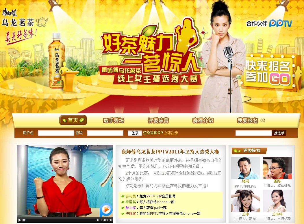 PPTV 網(wǎng)絡(luò)電視與康師傅烏龍茗茶全權(quán)合作的女主播選秀,旨在展現(xiàn)茗媛選手不一樣的知性美;同時將精心打造魅力訓(xùn)練營,讓廣大網(wǎng)友們看到茗媛們化繭成蝶的全過程。PPTV 網(wǎng)絡(luò)電視 CEO 陶闖博士、著名主持人董路等將共同對選手們進(jìn)行多角度麻辣點評。該活動已于6月1日正式開始海選,網(wǎng)友登陸活動頁面即可上傳視頻以及隨時與選手們進(jìn)行深度互動。本次活動通過一系列線上選拔環(huán)節(jié),選手去留由網(wǎng)友全權(quán)投票決定,最終選出2位優(yōu)勝者,成為 PPTV 網(wǎng)絡(luò)電視簽約主持人,主持 PPTV 網(wǎng)絡(luò)電視頻道日常自制節(jié)目。