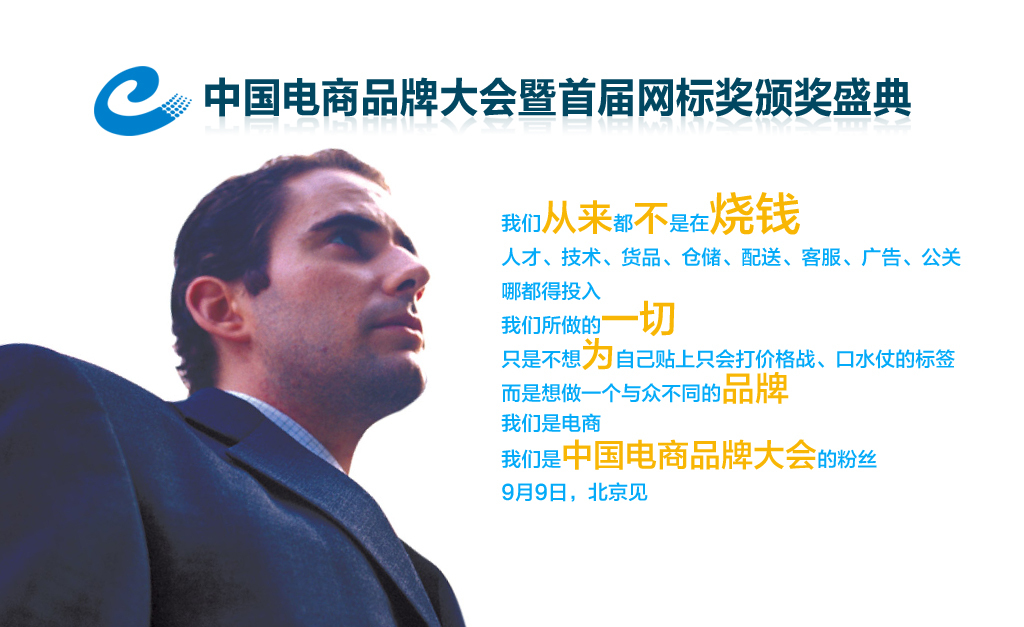 北京2011年8月15日電 /美通社亞洲/ -- 無電商,不品牌!由全球華人電子商務(wù)協(xié)會、中國電子商務(wù)協(xié)會網(wǎng)絡(luò)整合營銷研究中心、中國企業(yè)家協(xié)會《廣告主市場觀察》雜志聯(lián)手主辦的首屆中國電商品牌大會暨網(wǎng)標(biāo)獎頒獎盛典將于9月9日在京舉行。屆時,當(dāng)當(dāng)網(wǎng)總裁李國慶、攜程網(wǎng)資深副總裁湯瀾、珂蘭鉆石 CEO 郭峰、糯米網(wǎng)總經(jīng)理沈博陽、瑞年國際 COO 倪燁武等老牌電商企業(yè)的領(lǐng)軍者、新興電商企業(yè)的運(yùn)營管理者、傳統(tǒng)電商企業(yè)的負(fù)責(zé)人等300余人業(yè)內(nèi)營銷傳播精英將齊聚一堂,就“電商品牌傳播、廣告創(chuàng)意與媒介策略”、“Solomo(社會化、本地化、移動化)趨勢下的電子商務(wù)”、“如何提高電商廣告的轉(zhuǎn)化率”、“傳統(tǒng)企業(yè)的電子商務(wù)營銷之路”、“電商品牌體驗(yàn)優(yōu)化之道”、“‘千團(tuán)大戰(zhàn)’品牌勝算策略”等六大主題展開討論,力圖為電商發(fā)展新階段的品牌打造之道出謀劃策,共同見證首屆中國電商品牌大會網(wǎng)標(biāo)獎標(biāo)桿品牌大獎、領(lǐng)軍人物大獎和經(jīng)典案例的誕生。