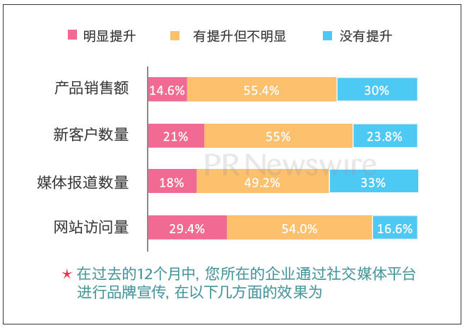 在過去12個(gè)月中,有近三成的企業(yè)表示社交媒體為企業(yè)網(wǎng)站所帶來的流量“明顯上升”,分別有超過半數(shù)的企業(yè)表示社交媒體平臺(tái)為企業(yè)帶來的新客戶數(shù)量及產(chǎn)品銷售額的影響“有提升但并不明顯”,2成左右的企業(yè)表示“有明顯提升”,在“媒體報(bào)道數(shù)量”方面,有18%的企業(yè)表示有“明顯提升”。