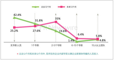 過去12個(gè)月和未來12個(gè)月中,您所在的企業(yè)內(nèi)部專職從事企業(yè)新媒體傳播的人員投入