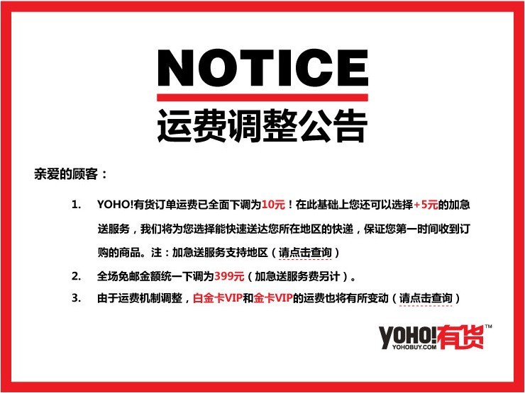 2012年起,YOHO!有貨將原來(lái)每單15元的運(yùn)費(fèi)下調(diào)至10元,購(gòu)物滿一定金額可免郵的門檻也由原來(lái)的500元下調(diào)至399元。YOHO!有貨物流負(fù)責(zé)人許凱介紹:“在快遞漲聲一片的大環(huán)境下,我們承擔(dān)差價(jià)補(bǔ)貼來(lái)下調(diào)運(yùn)費(fèi),希望降低用戶潮流網(wǎng)購(gòu)的門檻。在此基礎(chǔ)上,仍會(huì)保持以往優(yōu)質(zhì)的物流服務(wù),運(yùn)費(fèi)降了,服務(wù)不能降?!贬槍?duì)節(jié)假日的購(gòu)物高峰,YOHO!有貨還推出加急送服務(wù),從訂單審核、物流制單、揀貨包裝、分撿出庫(kù)等各環(huán)節(jié)采取優(yōu)先措施,更大程度上滿足不同用戶的物流需求。