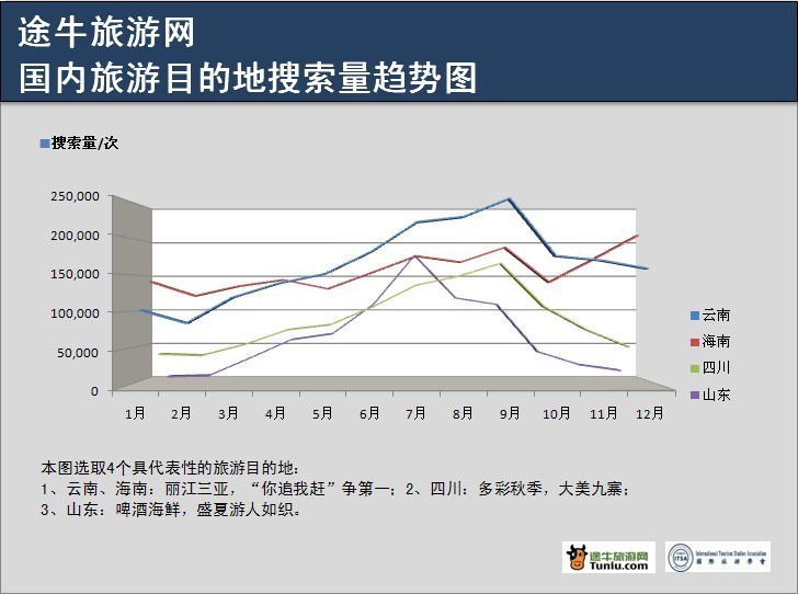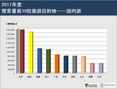 消費者2011年度在途牛旅游網(wǎng)的搜索量分析結(jié)果顯示,東南亞、海南、云南這三個方向的全年搜索人數(shù)占到了總搜索量的近28%,出游人數(shù)非常可觀;此外,福建、香港、四川及出境日韓方向受消費者青睞程度相當(dāng)不俗。就整體時間軸分布來看,2011年度淡旺季趨勢與往年差別不大,6月中旬開始進(jìn)入出游高峰期,至7月中旬達(dá)到第一個旅游峰值,在經(jīng)歷短暫小低潮后,至國慶黃金周再次達(dá)到極值。受國慶黃金周的影響,8、9月份的整體搜索量較高,達(dá)年度較低搜索月度的2.54倍。