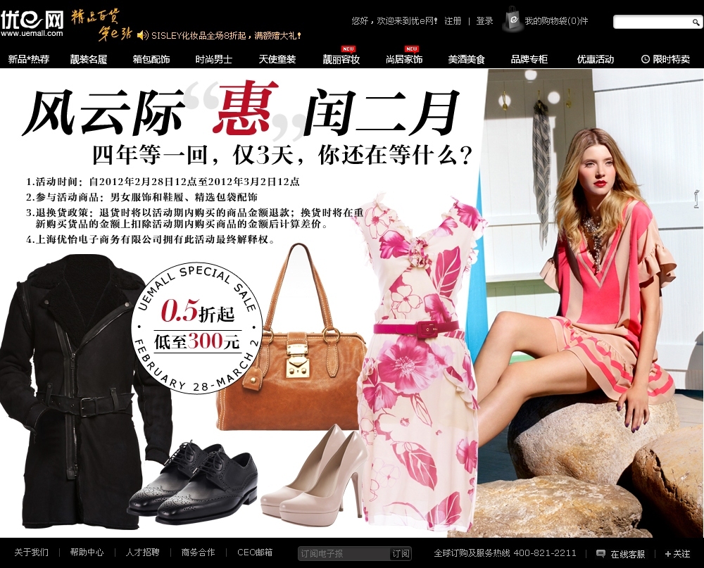 上海2012年2月28日電 /美通社亞洲/ --國內(nèi)首家網(wǎng)上精品百貨商城優(yōu)e網(wǎng)(www.uemall.com)將于2月28日至3月1日推出“風(fēng)云際‘惠’閏二月”主題促銷活動。較低0.5折的勁爆折扣,為網(wǎng)購達(dá)人提供了添置時尚奢品的絕佳時機(jī)。