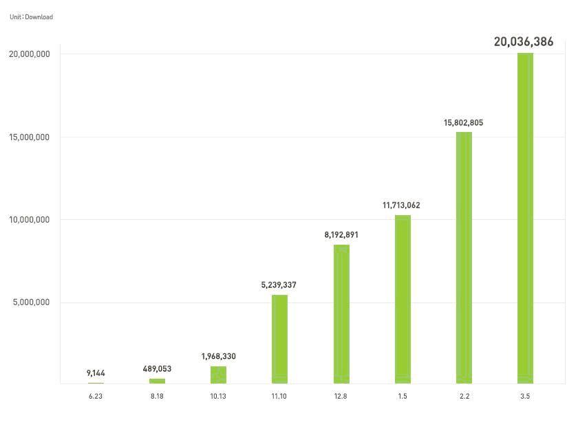 結(jié)果是在下載量達(dá)到1500萬后僅一個月的時間里再增500萬,自服務(wù)開始后8個月內(nèi),累計下載量達(dá)到了2000萬次。