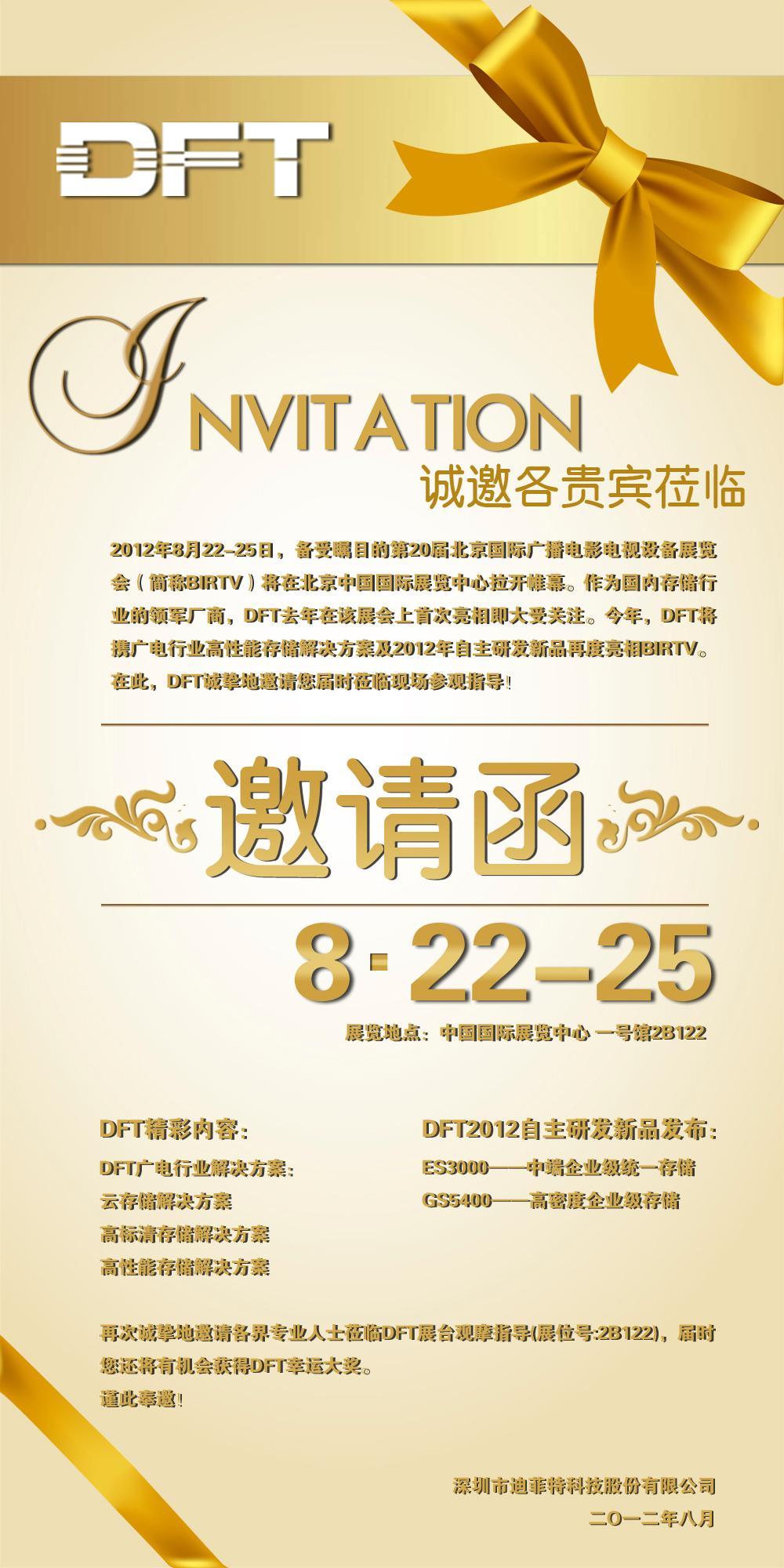 深圳2012年8月20日電 /美通社亞洲/ -- 2012年8月22-25日,備受矚目的第20屆北京國際廣播電影電視設(shè)備展覽會(簡稱BIRTV)將在北京中國國際展覽中心拉開帷幕。作為國內(nèi)存儲行業(yè)的領(lǐng)軍廠商,DFT去年在該展會上首次亮相即大受關(guān)注。今年,DFT將攜廣電行業(yè)高性能存儲解決方案及2012年自主研發(fā)新品再度亮相BIRTV。在此,DFT誠摯地邀請您屆時蒞臨現(xiàn)場參觀指導(dǎo)!