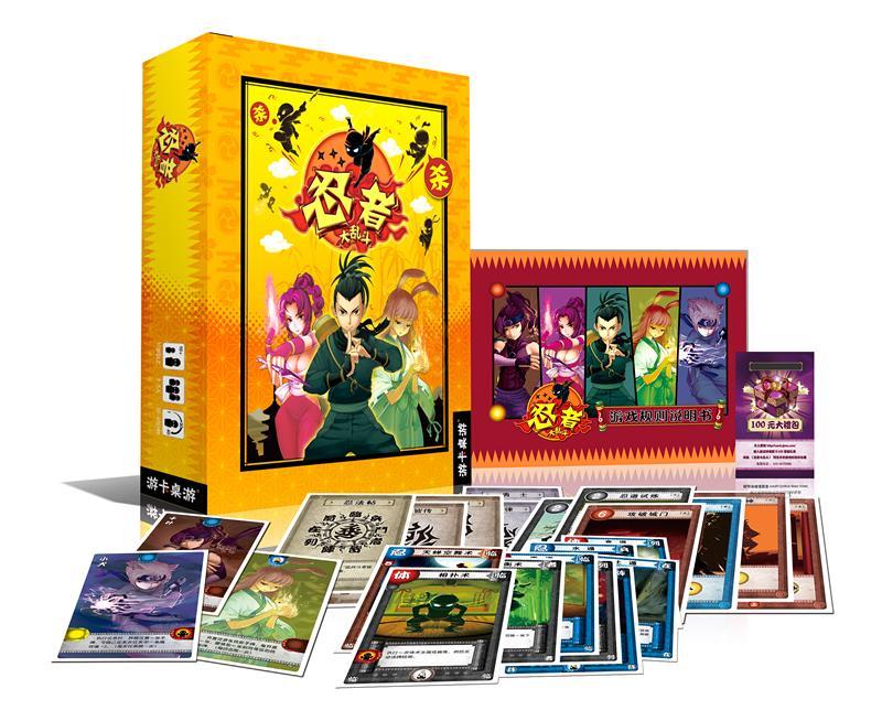 每盒《忍者大亂斗》,包含技能牌75張、任務(wù)牌24張、忍具牌18張、成就牌11張、人物牌5張、參考卡5張、共138張游戲牌,另附說(shuō)明書1份、刮刮卡1張。卡牌畫工細(xì)膩,并采用高檔藍(lán)芯紙制作,零售價(jià)39元。