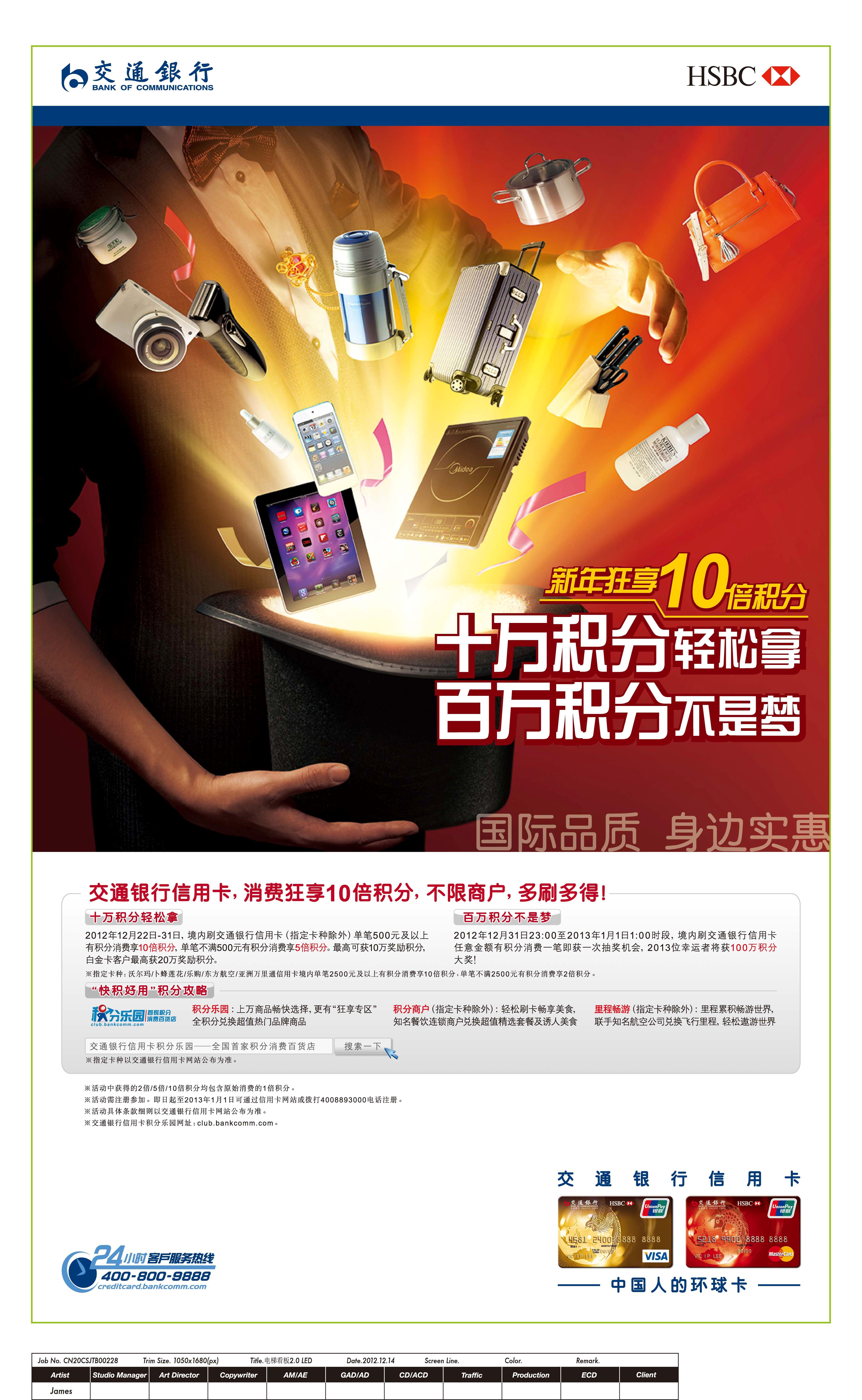 上海2012年12月19日電 /美通社/ -- 近期,交通銀行信用卡將推出“10萬積分輕松拿 百萬積分不是夢”活動,為年末這一片繁榮的購物景象錦上添花。交通銀行信用卡持卡人境內(nèi)刷卡滿額就可獲得高達(dá)5至10倍的積分獎勵,在12月31日至1月1日更有機(jī)會輕松贏得百萬積分大獎!滿足購物需求的同時(shí),還可以享受交通銀行信用卡的積分豪禮,這樣的雙重驚喜,必定讓年末的血拼季更加充滿誘惑。