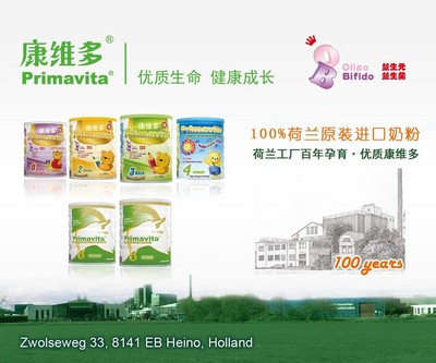 北京2013年1月18日電 /美通社/ -- 很多新手媽媽會(huì)因?yàn)椴恢涝撊绾芜x擇配方奶粉而犯愁,尤其是看到一大串似懂非懂的營(yíng)養(yǎng)列表更是一頭霧水。什么樣的配方奶粉是適合自己寶寶的呢?荷蘭原裝進(jìn)口系列配方奶粉品牌康維多(PRIMAVITA),解密配方奶粉營(yíng)養(yǎng)成分,為媽媽講解嬰幼兒配方奶粉中常見的營(yíng)養(yǎng)成分及主要功能。