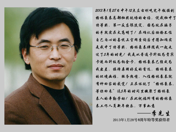 季先生是格林豪泰鉑金卡會員,從2008年開始就入住格林豪泰,也算是格林豪泰的一名老顧客。“一般出差或者招待朋友、客人,都會選擇格林豪泰酒店,格林豪泰舒適、干凈的入住體驗,以及滿意周到的服務是我選擇格林豪泰的理由,很感謝格林豪泰舉辦這次活動”!被問及獲獎感言時,季先生響亮地喊出了格林豪泰的宣傳語 -- “格林豪泰,等您回來”!