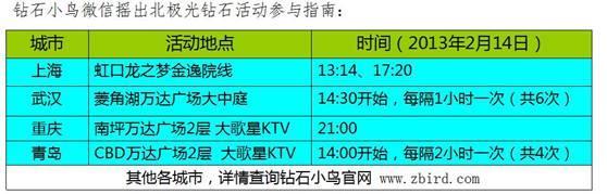 他透露,2月14日當(dāng)天只要在所在城市指定的地點(diǎn)參與鉆石小鳥微信搖一搖活動便可獲贈鉆石小鳥北極光鉆石及其他精美禮品,為此,鉆石小鳥特別設(shè)置開通了“鉆石小鳥北極光”這一官方微信號,只要在活動現(xiàn)場通過微信搖動手機(jī),添加加這一官方微信號并成功打招呼,便有了獲得禮品的資格。