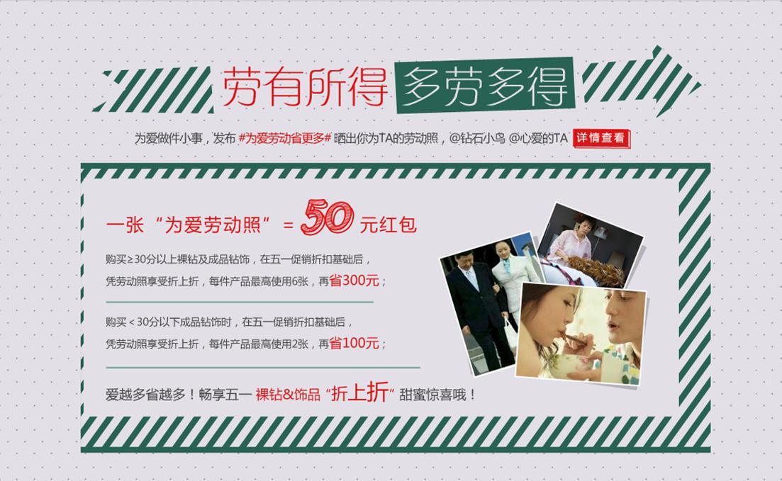 “愛情任務(wù)”也是非常有趣的環(huán)節(jié)。愛人之間哪怕一些小的舉動都會令對方感動不已,而作為一個稱職的愛人是否在這個勞動節(jié)對對方有所表示呢?你為對方斟了一杯香濃的咖啡抑或做了一桌可口的飯菜,或者喂對方吃了一口心儀的甜品。在微博上曬一張勞動照片并@鉆石小鳥,就可得50元現(xiàn)金抵用券,愛心付出越多,收獲也將會更多。在活動期間至鉆石小鳥各地體驗中的消費者也能現(xiàn)場完成任務(wù)表達愛意。