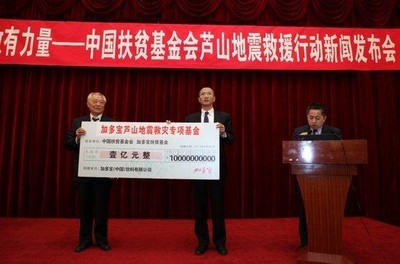 四川雅安蘆山地震發(fā)生后,中國扶貧基金會立刻緊急啟動應急救災程序。地震發(fā)生兩小時后,聯(lián)合騰訊公益慈善基金會發(fā)布雅安地震緊急救援樂捐項目,聯(lián)合新浪網(wǎng)發(fā)布有你救有力量—雅安地震緊急救援倡議書,下午三點決定向地震災區(qū)捐贈100萬元,下午五點追加到200萬元用于采購緊急救援物資,并派出緊急救援隊前往蘆山評估災情、采購發(fā)放救災物資,當晚24點,緊急救援隊到達災區(qū),立刻向當?shù)睾献骰锇榱私鉃膮^(qū)救援情況、受災情況及災區(qū)需求。中國扶貧基金會四川蘆山救援行動啟動后,許多愛心企業(yè)和公眾積極響應,踴躍捐款捐物,大力支持一線救災工作。恒大集團第一時間與中國扶貧基金會溝通,了解了災情和災民需求后率先捐贈2000萬元;英特爾捐款1000萬元并將與中國扶貧基金會創(chuàng)新模式,探索企業(yè)捐款在救災和重建過程中更有效、更有價值的使用;三六一度(中國)捐贈800萬元、安利捐贈500萬元、如新(中國)捐贈1000萬元、天喔食品集團捐贈500萬元物資;愛心公眾通過騰訊樂捐、新浪微公益、支付寶公益、返利網(wǎng)、短信捐贈平臺、淘寶官方店、銀行賬戶等捐贈平臺捐款225.6萬元。截至4月23日早上九點,社會各界捐款捐物超過1億元。新聞發(fā)布會上,中國扶貧基金會段應碧會長,副會長江紹高、王行最接受了愛心企業(yè)和個人的捐贈。