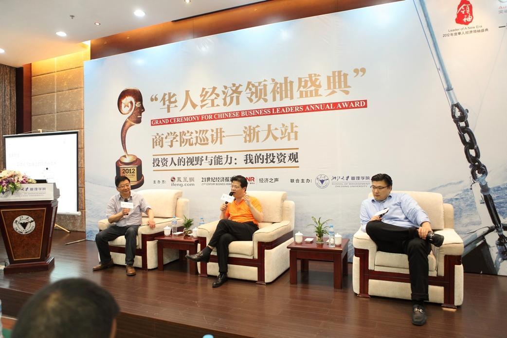 北京2013年5月27日電 /美通社/ -- 5月24日下午,在浙江大學(xué)紫金港校區(qū)啟真湖畔,一場商界領(lǐng)袖與青年精英們的風云對話進行得如火如荼。值浙江大學(xué)建校116周年之際,由鳳凰網(wǎng)、《21世紀經(jīng)濟報道》、中央人民廣播電臺經(jīng)濟之聲主辦的“華人經(jīng)濟領(lǐng)袖盛典”商學(xué)院巡講走進了浙江大學(xué)管理學(xué)院,與位于經(jīng)濟前沿的浙江大學(xué)管理學(xué)院的學(xué)子們激蕩思想,分享經(jīng)驗。