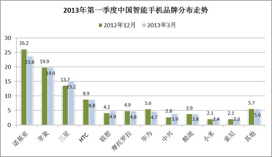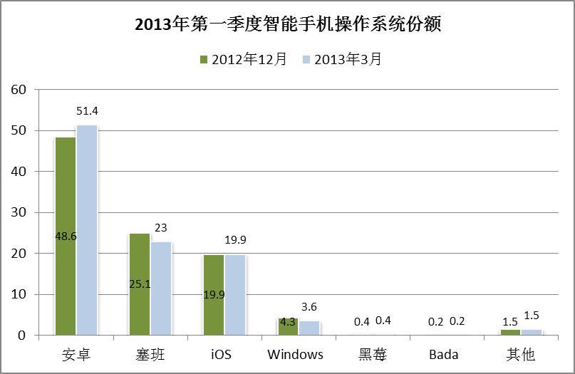 Kantar Worldpanel移動通訊消費者指數(shù)的連續(xù)性研究發(fā)現(xiàn),第一季度安卓系統(tǒng)在整體智能機市場的份額上升至51.4%,環(huán)比上升2.8%。這是安卓系統(tǒng)第一次在中國正式占有超過半數(shù)的智能機市場,而二,三位仍然是塞班和iOS系統(tǒng),市場份額分別為23%和19.9%。較2012年第四季度,塞班系統(tǒng)的市場份額下降了超過2個百分點,但iOS保持不變停留在將近20%的市場份額。按照趨勢推測,在2013年第二至第三季度中,安卓將會繼續(xù)擴大在智能機的主導地位,塞班則將讓位給iOS退為第三大智能機操作系統(tǒng)。