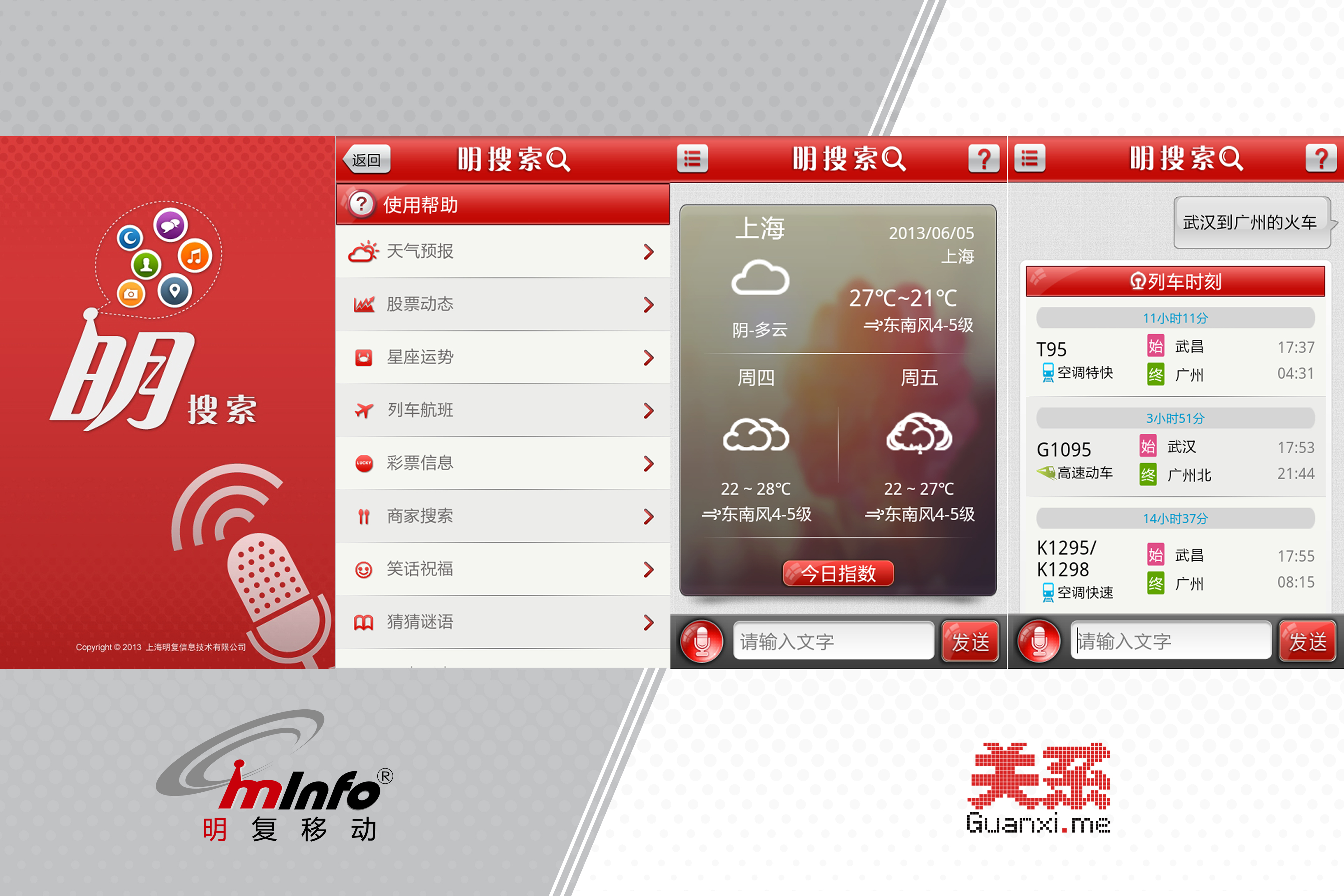 該款A(yù)PP囊括本地生活、娛樂休閑、實(shí)用信息等20余種信息,為用戶提供衣食住行、天氣、航班、股票等全方位的信息搜索服務(wù)。它是明復(fù)(@明復(fù)mInfo)傳統(tǒng)手機(jī)服務(wù)“明生活”和“明搜索”的升級(jí)版,優(yōu)化了手機(jī)客戶端界面及結(jié)果展現(xiàn)方式。內(nèi)容和技術(shù)的強(qiáng)強(qiáng)聯(lián)合,對(duì)話的交互方式,使它擁有絲毫不遜色于Siri的用戶體驗(yàn),但面向更廣泛的手機(jī)用戶群體。