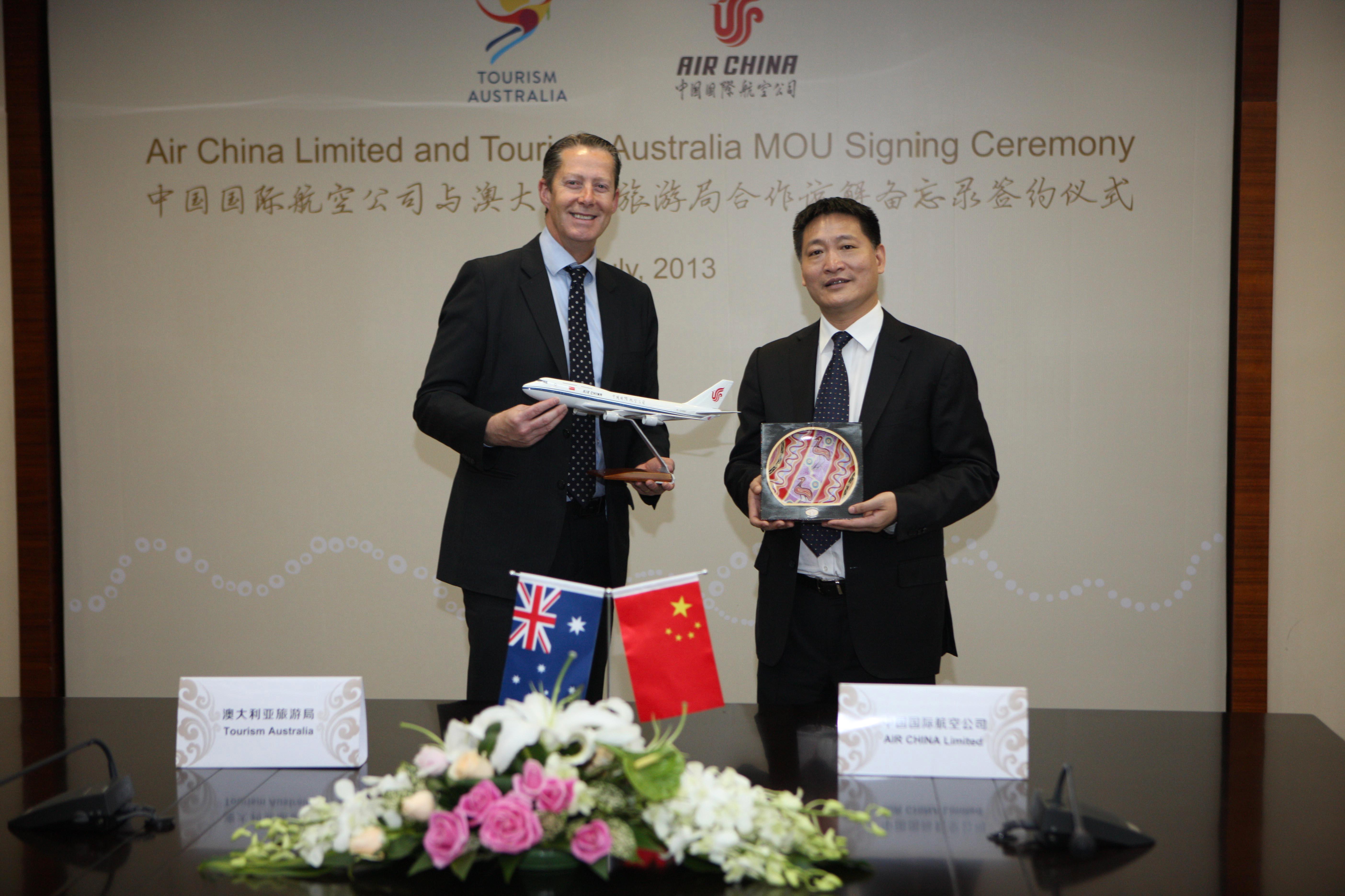 北京2013年7月2日電 /美通社/ -- 2013年7月1日,中國國際航空股份有限公司(以下簡(jiǎn)稱“國航”)與澳大利亞旅游局(以下簡(jiǎn)稱“澳旅局”)舉辦合作諒解備忘錄簽字儀式,雙方高層就赴澳旅游市場(chǎng)推廣及航空運(yùn)力優(yōu)化配置達(dá)成協(xié)議。國航副總裁王明遠(yuǎn)及澳旅局行政總裁麥勤偉(Andrew McEvoy)代表雙方簽署了備忘錄。