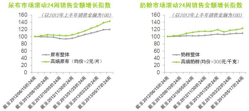 Kantar Worldpanel嬰兒樣組的監(jiān)測還顯示,高端的尿片產(chǎn)品在2013年1-5月銷售金額同比去年增長46%;而嬰幼兒奶粉市場中,雖然高端奶粉滲透率增長已經(jīng)放緩,但是消費者對高端奶粉仍然趨之若鶩,高端奶粉產(chǎn)品在今年1-5月的銷售額同比增長25%。同時,一個有趣的市場現(xiàn)象是,無論高端奶粉還是高端尿片,在中低收入家庭中滲透率增長在過去一年要快于高收入家庭,在省會級城市的滲透率增速也超過了重點城市(北京、上海、廣州、成都),這說明高端的嬰兒產(chǎn)品正在逐步滲入到各類家庭和城市級別中去, 這對于生產(chǎn)商和零售商來說都意味著巨大的產(chǎn)品升級的商機。