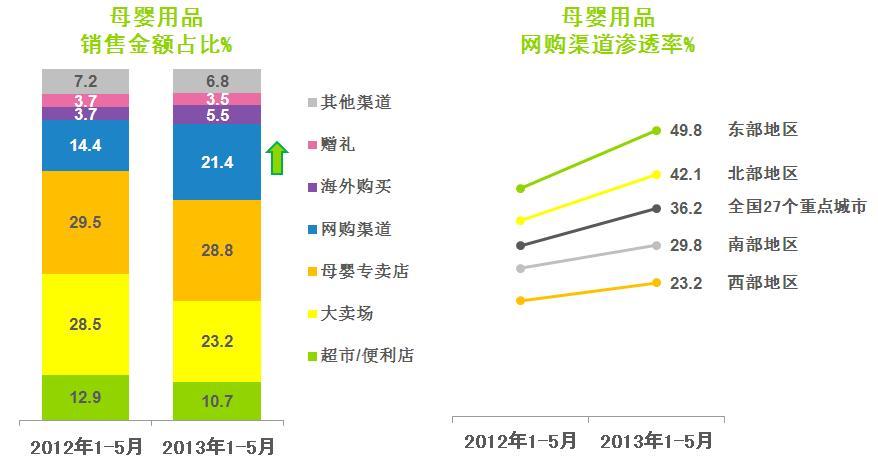 Kantar Worldpanel嬰兒樣組數(shù)據(jù)顯示,在重點及省會城市中整體母嬰用品網(wǎng)購滲透率在今年1-5月中已經(jīng)高達36.2%,而整體非食品快消品類的網(wǎng)購滲透率卻只有16.3%。其中網(wǎng)購滲透率增長較快的是以北京、上海為代表的北部與東部地區(qū):滲透率分別達到了49.8%和42.1%。這意味著如果廠商要接觸到更多的消費者,就必須加強自己品牌在電子商務(wù)渠道的推廣。通過和不同電商平臺的合作,企業(yè)能讓自己的產(chǎn)品獲得更加廣泛的成長機會。