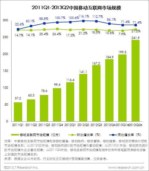 2013Q2移動互聯(lián)網(wǎng)市場規(guī)模241.9億元,環(huán)比增速21.2%,同比增速71.4%,市場趨于穩(wěn)健發(fā)展。艾瑞認為,2013年移動互聯(lián)網(wǎng)市場發(fā)展逐漸明朗,商業(yè)模式探索進一步深入,有望在今年得到突破。主要在于:一是傳統(tǒng)互聯(lián)網(wǎng)公司投資并購不斷,延續(xù)PC優(yōu)勢的同時不斷補齊自身短板,移動戰(zhàn)略布局基本完成;二是傳統(tǒng)行業(yè)企業(yè)進一步認可移動互聯(lián)網(wǎng)商業(yè)價值,積極投身參與,進一步推動市場向前發(fā)展。