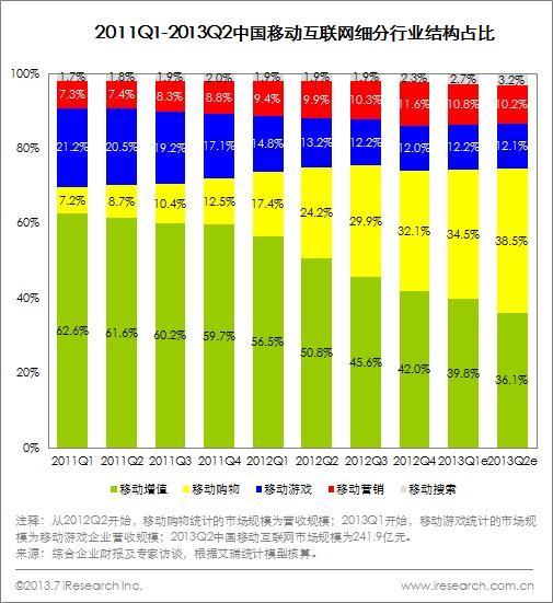 2013年第二季度移動購物市場繼續(xù)保持高速增長態(tài)勢,市場占比超越移動增值,成為移動互聯(lián)網(wǎng)第一大細分行業(yè)。主要原因在于:一是傳統(tǒng)增值服務增長疲軟,移動增值市場份額逐漸萎縮;二是移動購物受傳統(tǒng)電商市場增長驅(qū)動,市場保持高速增長,另外用戶移動購物習慣逐漸形成,進一步推動移動購物成為移動互聯(lián)網(wǎng)第一大細分行業(yè)。艾瑞預計,移動購物未來將繼續(xù)保持第一細分行業(yè)地位,引領移動互聯(lián)網(wǎng)市場規(guī)模實現(xiàn)新突破。
