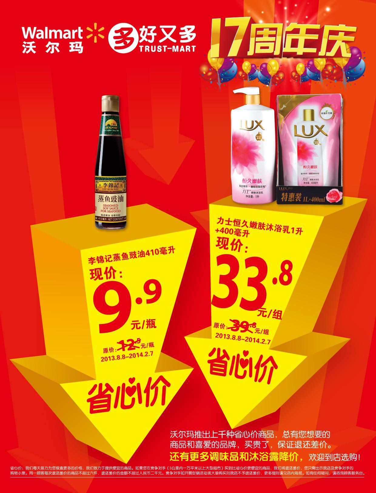 中國深圳2013年8月8日電 /美通社/ -- 今天,沃爾瑪再推特別“省心價(jià)”商品:力士恒久嫩膚沐浴乳(1升+400毫升)和李錦記蒸魚豉油(410毫升)。這兩款商品的零售價(jià)格分別是:33.8元和9.9元,降價(jià)幅度分別達(dá)15%和20%,且價(jià)格有效期長達(dá)半年至2014年2月7日。這已是沃爾瑪今年第三次推出特別“省心價(jià)”商品。