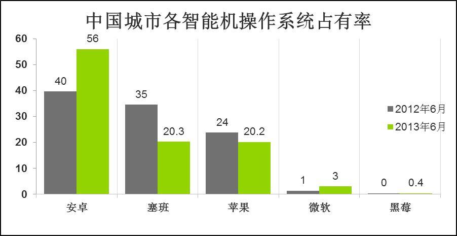 過(guò)去的12個(gè)月里,各個(gè)智能機(jī)操作系統(tǒng)的市場(chǎng)占有率發(fā)生了巨大變化。譬如,安卓至2013年6月底在中國(guó)主要城市占有智能機(jī)市場(chǎng)56%的份額,同比增長(zhǎng)幅度達(dá)到了41%。與此對(duì)應(yīng)的塞班系統(tǒng)卻是過(guò)去12個(gè)月中較大的輸家,丟失了14.3個(gè)百分點(diǎn)至20.3%,也就意味著若塞班繼續(xù)其下探速度,市場(chǎng)中50%的現(xiàn)有塞班用戶(hù)會(huì)在接下去的12個(gè)月離開(kāi)購(gòu)買(mǎi)其他新手機(jī),蘋(píng)果則可能近期取代塞班成為中國(guó)第二大智能機(jī)操作系統(tǒng)。對(duì)于各手機(jī)品牌來(lái)說(shuō),接下去很大一部分的商機(jī)則是如何贏取剩余的塞班用戶(hù),而手機(jī)價(jià)格將是取決于這些消費(fèi)者走向的重要因素之一。