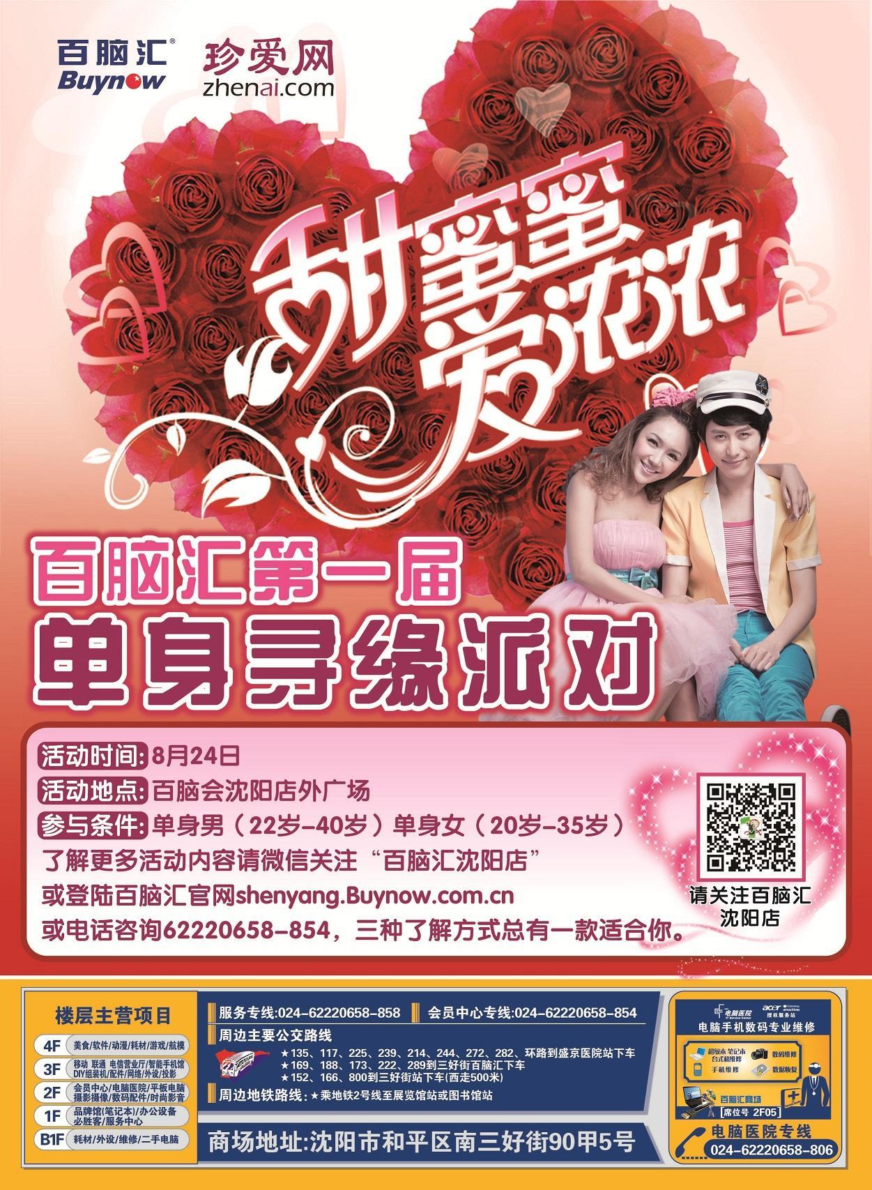 沈陽2013年8月21日電 /美通社/ -- 夏日戀愛正當(dāng)時,什么?你還沒有對象可戀、沒有情感可托?那可不要錯過這個免費(fèi)的“脫光”機(jī)會。8月24日,珍愛網(wǎng)單身尋緣派對登陸沈陽百腦匯,近千名優(yōu)質(zhì)單身男女與你相約“甜蜜蜜,愛濃濃”百腦匯第一屆單身尋緣派對,更有多款精美禮品參與就送。